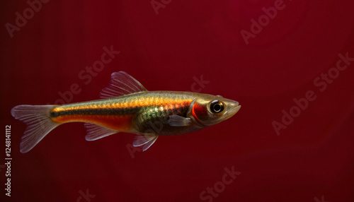 Glowing neon tetra swimming gracefully against bordo background, artistic depth