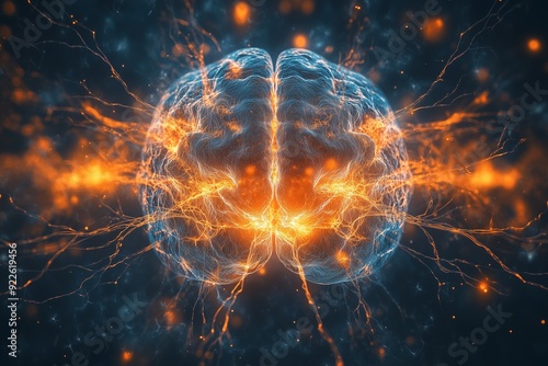 Glowing neural pathways in human brain with blue background - brain activity, science visualization