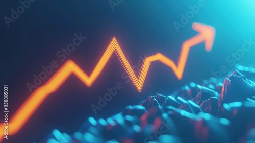 Glowing orange arrow graph rising on dark blue background.