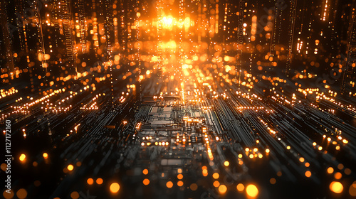 Glowing orange data streams fall onto a dark circuit board creating a vibrant digital network visualization Abstract tech background