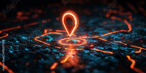 Glowing Orange Pinpoint on a Dark Circuit Board with Neon Blue and Orange Lines.
