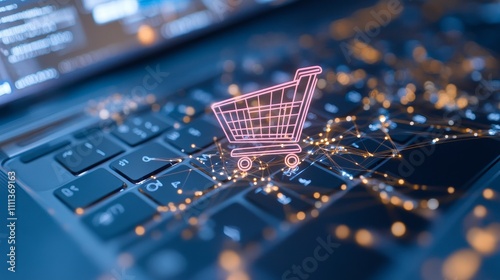 Glowing pink shopping cart icon on laptop keyboard with deep blue background, creating a striking contrast and emphasizing online shopping and technology with soft lighting.