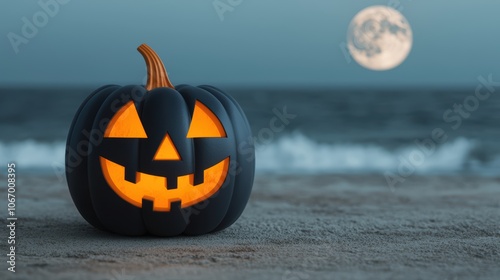 Glowing Pumpkin Lantern on Deserted Beach at Night