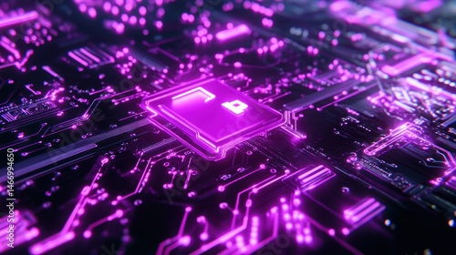 Glowing purple CPU on circuit board.