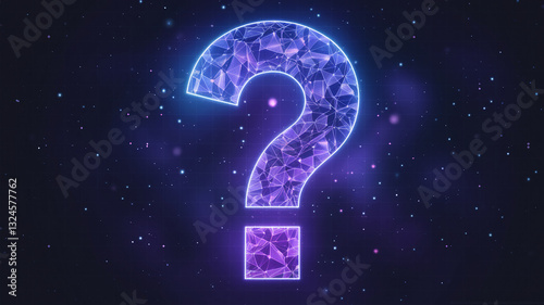 Glowing purple question and exclamation marks, low-poly style, on dark cosmic background, symbolizing mystery, inquiry, and answers, perfect for website banners or app interfaces