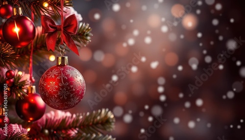 Glowing Red Christmas Ornaments on a Decorated Tree with Soft Falling Snow