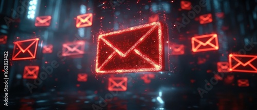 Glowing red digital envelopes floating in a dark futuristic space representing electronic communication and data flow