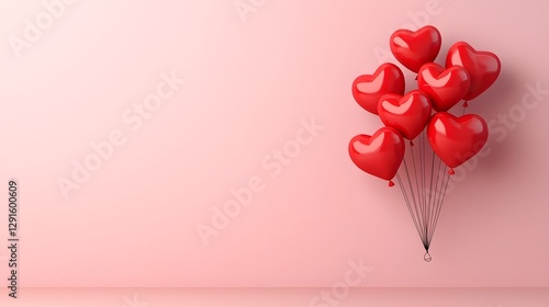 Glowing red heart shaped balloons floating elegantly on a soft pastel pink gradient background creating a romantic and captivating visual display