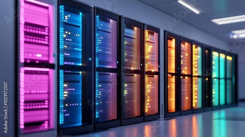 Glowing server racks in a colorful data center, neon lights and advanced technology, futuristic network hub, vibrant and high-tech environment