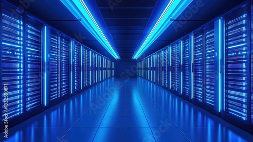 Glowing server racks in a modern data center, showcasing advanced technology and digital infrastructure.
