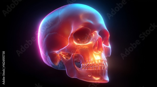 Glowing Skull: A vivid, neon-lit skull emerges from the darkness, its contours highlighted by an interplay of red and blue hues, creating a stunning and artistic portrayal of human anatomy.