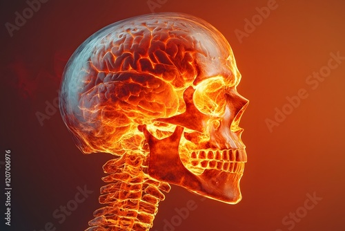 Glowing Skull Anatomy with Vibrant Brain in Fiery Gradient Backdrop