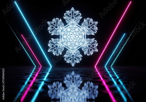 Glowing snowflake art with neon light reflections and abstract winter geometric patterns