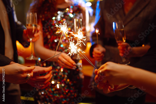 Glowing sparkles in hands. Group of happy people enjoying party with fireworks. Winter holiday.