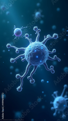 Glowing spirillum bacterium fuses with spiral-tendriled virus in microscopic detail, with ethereal bokeh background of distant microbes.