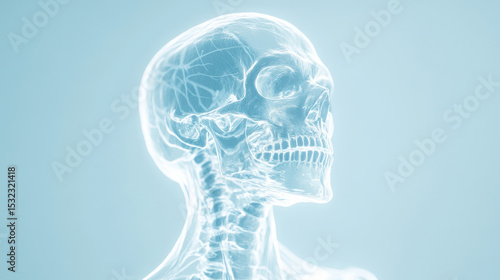 Glowing transparent human skull and neck bones with visible veins and teeth in blue medical background