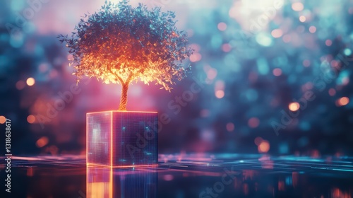 Glowing Tree of Life: An enchanting image of a stylized tree growing out of a glowing cube, symbolizing growth, nature, and innovation. Set against a dreamy bokeh background.
