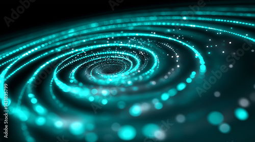 Glowing turquoise spiral made of digital particles swirling in a dark abstract space.