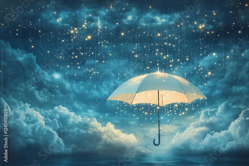 Glowing umbrella floating among the clouds, surrounded by shimmering stars like raindrops. A dreamy, surreal composition symbolizing protection, fantasy, and imagination. Perfect for creative concepts