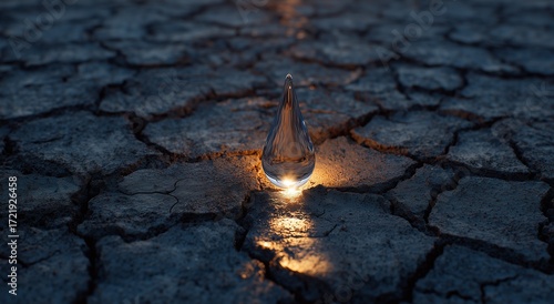 Glowing water drop on cracked dry soil at dusk. Symbol of climate change, drought, global warming, water scarcity, ecology crisis, sustainability, hope, nature conservation and environmental risk.