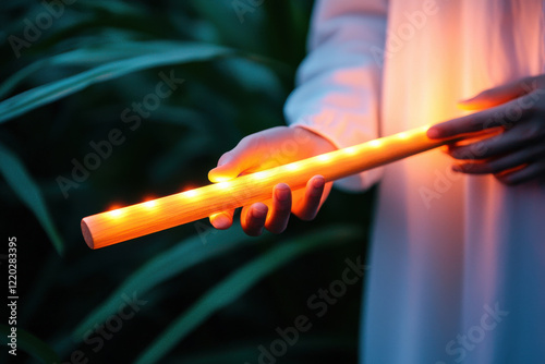 glowing wooden flute held gently in serene lighting