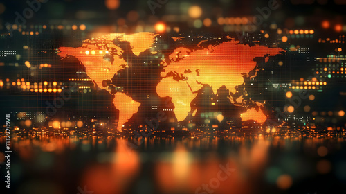Glowing World Map Shows Global Connections with Digital Overlay and Blurred City Lights Background