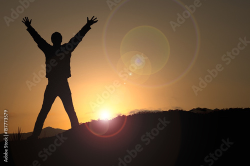 Glücklich und erfolgreich jubelnd bei Sonnenuntergang