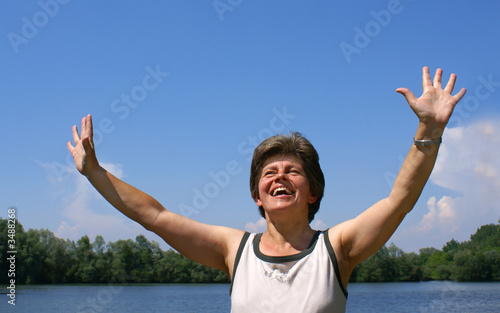glückliche Frau im Sommer, reisst Arme hoch, am Wasser, copy space