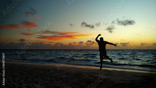 Glücklicher Mann springt am Meer zum Sonnenuntergang