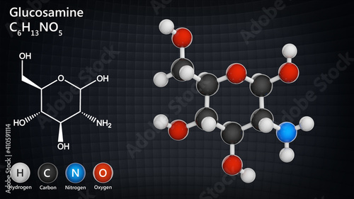 Glucosamine (C6H13NO5) is an amino sugar. treatment for osteoarthritis. Chemical structure model: Ball and Stick. 3D illustration.