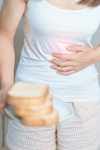 Gluten intolerance, Gluten free and celiac disease or wheat allergy concept. woman hold Bread and having abdominal pain after eat gluten. stomach ache, Nausea, Bloating, Gas, Diarrhea and Skin rash