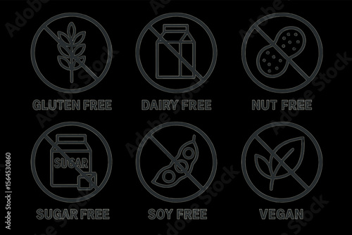 Gluten-free, dairy-free, nut-free, sugar-free, soy-free, vegan symbols