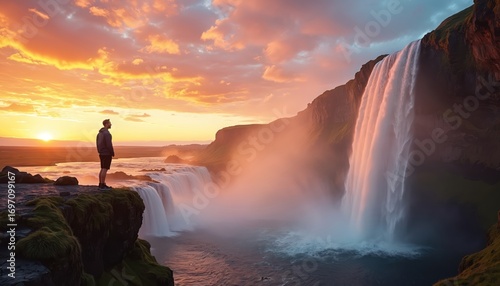 Goðafoss waterfall in Iceland flows during vibrant sunset. Lone male tourist stands on mossy cliff edge, contemplating summer scenery. Majestic cascade plunges into water, creating mist. Beautiful