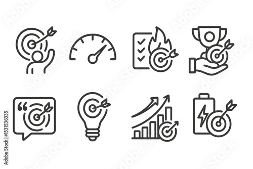 Goal Icons Collection. Line style icons of goal setting: motivational goals, boost meter, fire tracker, reward plan, quote aim,