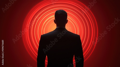 Goal setting 2025 achievements challenges concepts. A silhouette of a person in a suit stands against vibrant red concentric circles, creating a striking and dramatic visual effect.