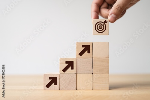 Goal setting and business growth with wooden blocks, upward arrows and target icon, strategy concept.