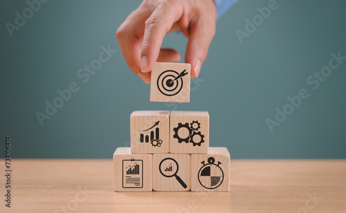 Goal setting planning focus for future. Goal aim target concept. Hand push target board on wooden cube block icon for creative set up business success objective. Achievement winner business project