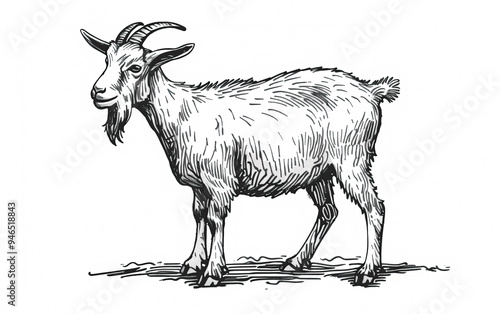 Goat. Vintage retro print, black white goat sketch ink pencil style drawing, engrave old school. Sketch artwork silhouette goat, white background. Side view profile. Illustration