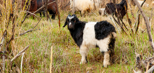 Goats in search of food roam the desert hot pasture. Moroccan goats climb trees to eat leaves. Sheep eat the remains of a watermelon.