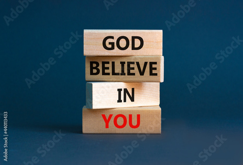 God believe in you symbol. Concept words 'God believe in you' on wooden blocks on a beautiful grey background. Businessman hand. Business, religion and God believe in you concept.
