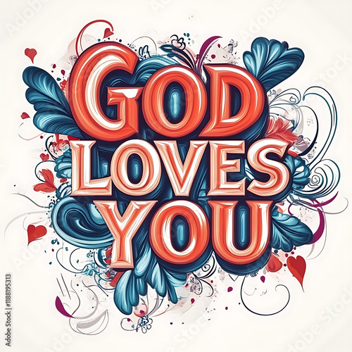 God loves you in vibrant typography surrounded by decorative elements and floral designs, conveying message of positivity and warmth