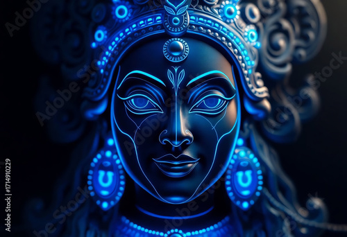 Goddess Durga face digital blue lines, depicting a stylized of the goddess Durga.