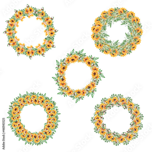 Gold sunflower wreaths fall watercolor clipart, set of 5