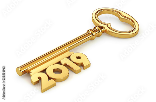 Gold 2019 key isolated on white background. 3d rendering. Illustration for advertising.