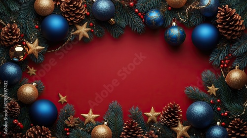 Gold and blue Christmas tree balls, pine cones, stars, and gold ribbon serpentine are arranged on pine branches on a red background with blank space.