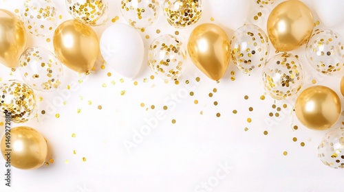 Gold and White Birthday Balloons with Confetti on Flat Lay Background