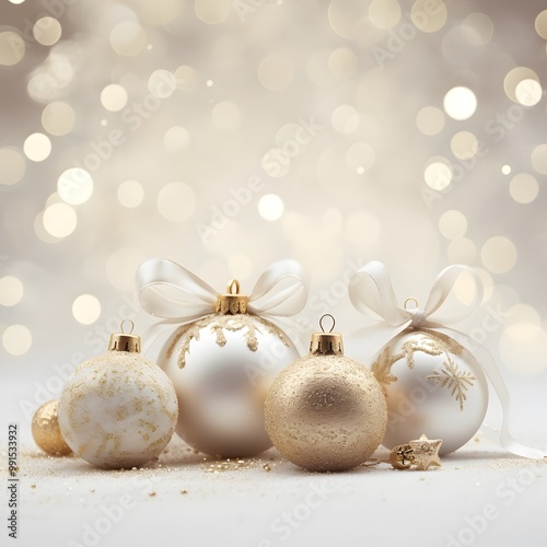 Gold and white Christmas mockup background product photography, christmas balls HD Banner with copy space for text, Merry Christmas Bokeh