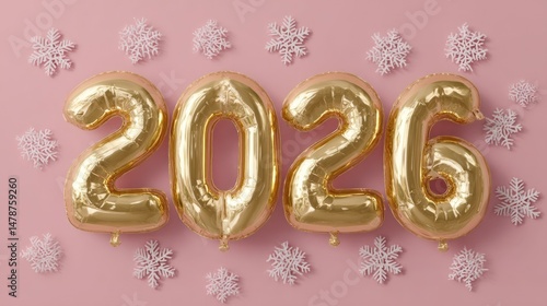 Gold balloons spelling out 2026, surrounded by snowflakes on a pink background