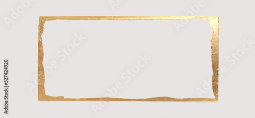 Gold (bronze) glitter empty frame on beige gray paper background. Abstract copy space texture.