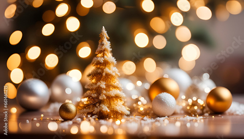 Gold christmas tree, golden winter decorations on white background with empty copy space for text. New year and christmas postcard
